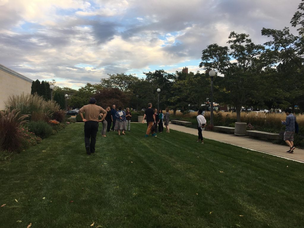 We had a little practice outside of Krannert Art Museum after Jennifer Monson introduced her works. During the practice, she guided us to feel the environment with our eyes closed. She enhanced our senses to the surroundings by using her speech, the senses through our skin, our ear, or any senses other than eyes.